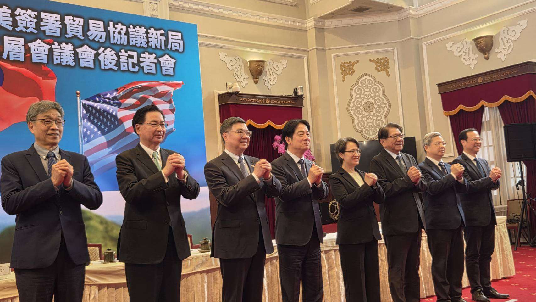 台、美正式完成「對等貿易協定」簽署後,賴清德總統在總統府召開國安高層會議,隨後率副總統蕭美琴、行政院長卓榮泰及相關部會首長召開記者會,說明政府面對台美經貿新局的整體戰略。