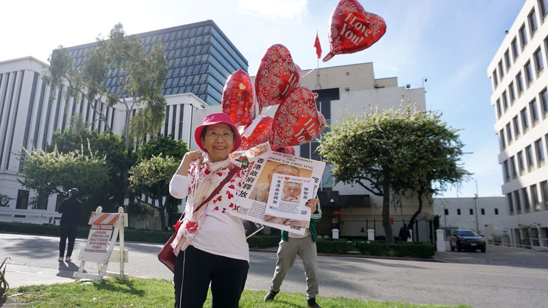 長期為香港民主發聲的「視覺藝術家協會」主席劉雅雅(Ann Lau)14日帶著紅色心型氣球在洛杉磯中國領事館前,聲援黎智英。她表示,每個香港人都熱愛香港,希望香港能夠保持自由、繁榮。(圖:中央社)