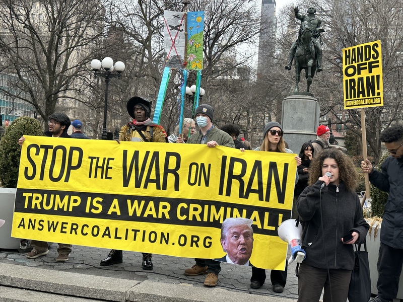 在紐約,示威者高舉黃色反戰標語及諷刺川普與尼坦雅胡的圖像,於曼哈頓聯合廣場(Union Square)聚集高喊口號;反戰的猶太團體也到場聲援。