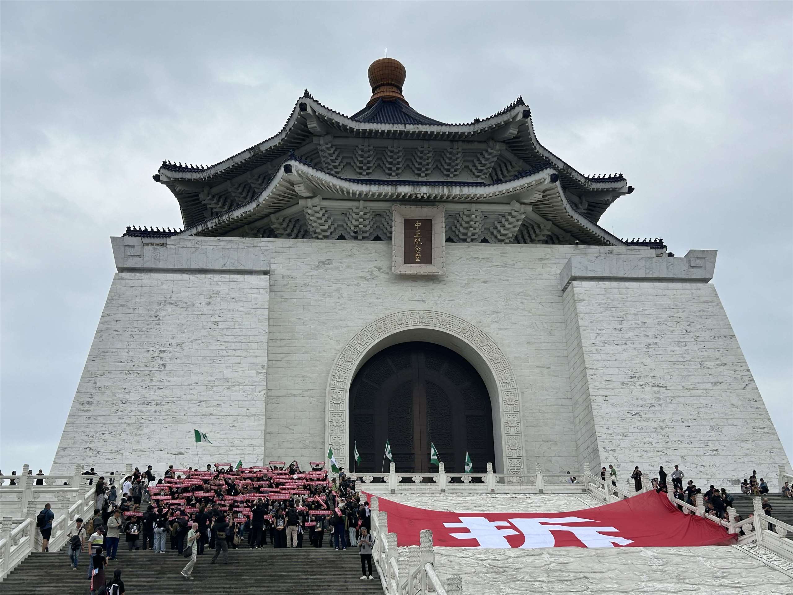 519行動組合及58個民間團體5日發起「台灣不需要獨裁者紀念堂」行動,他們繞行堂體階梯,高喊「台灣不需要獨裁者紀念堂」,並於中正紀念堂樓梯擺上大面的「拆」字。(趙婉淳 攝)