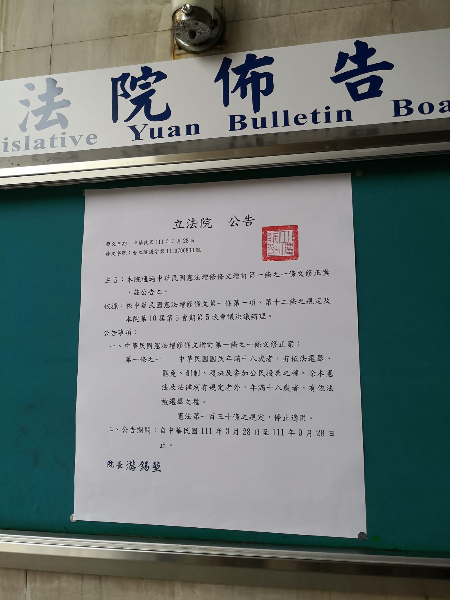 立法院院會25日在朝野一致支持下,以109張贊成票表決通過攸關「18歲公民權」的「中華民國憲法增修條文增訂第一條之一條文」。立法院長游錫堃28日偕同朝野各黨團總召在立法院公佈欄張貼修憲案公告,此修憲案即日起公告半年至9月28日,之後則將交由中選會於3個月內舉行公民複決投票。