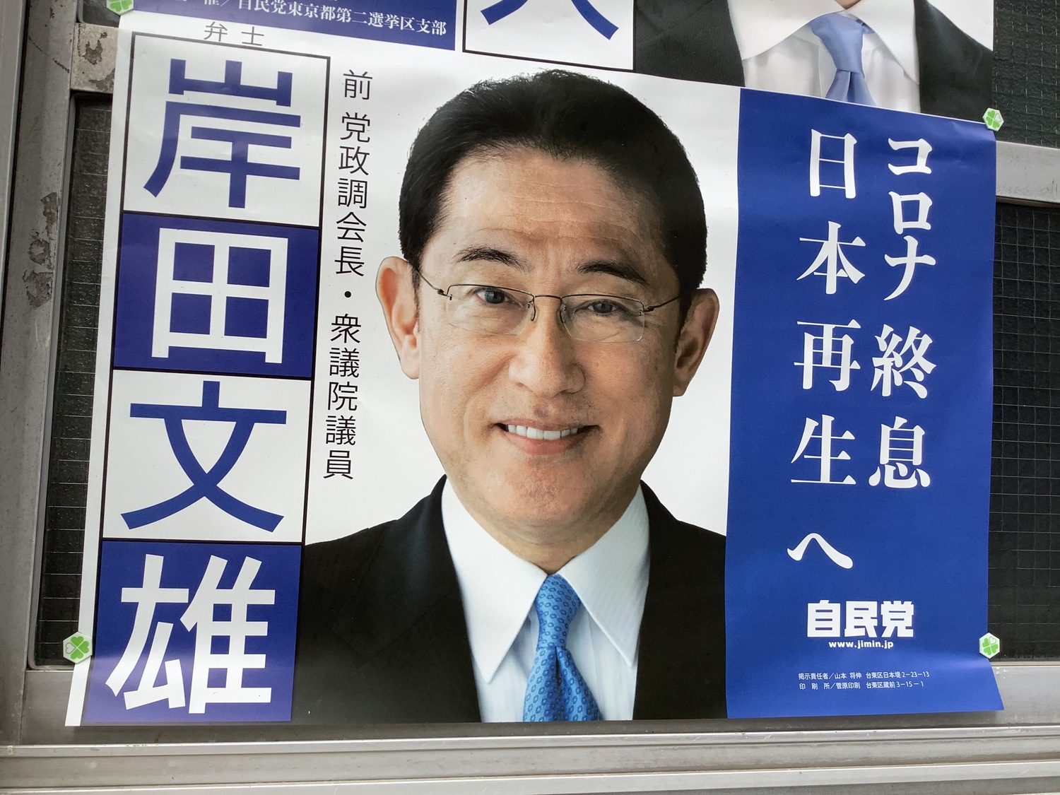 日本自民黨總裁選舉,岸田文雄有贏面,因此開始有議員候選人用岸田當招牌,貼出海報。圖:劉黎兒/提供