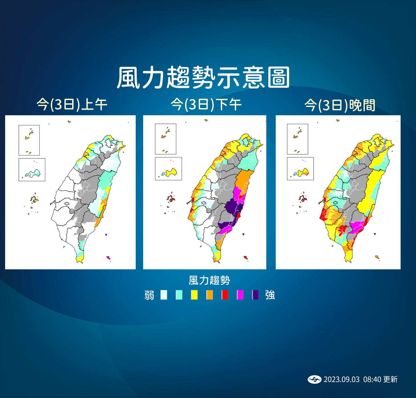 隨著颱風於傍晚登陸之後,將逐漸進入台灣西南部地區,因此從3日晚上開始,在南部地區的降雨也會逐步的增強,預計高雄跟屏東可能都會有豪雨出現;入夜之後,中部地區的風雨也可能會明顯的增強。
