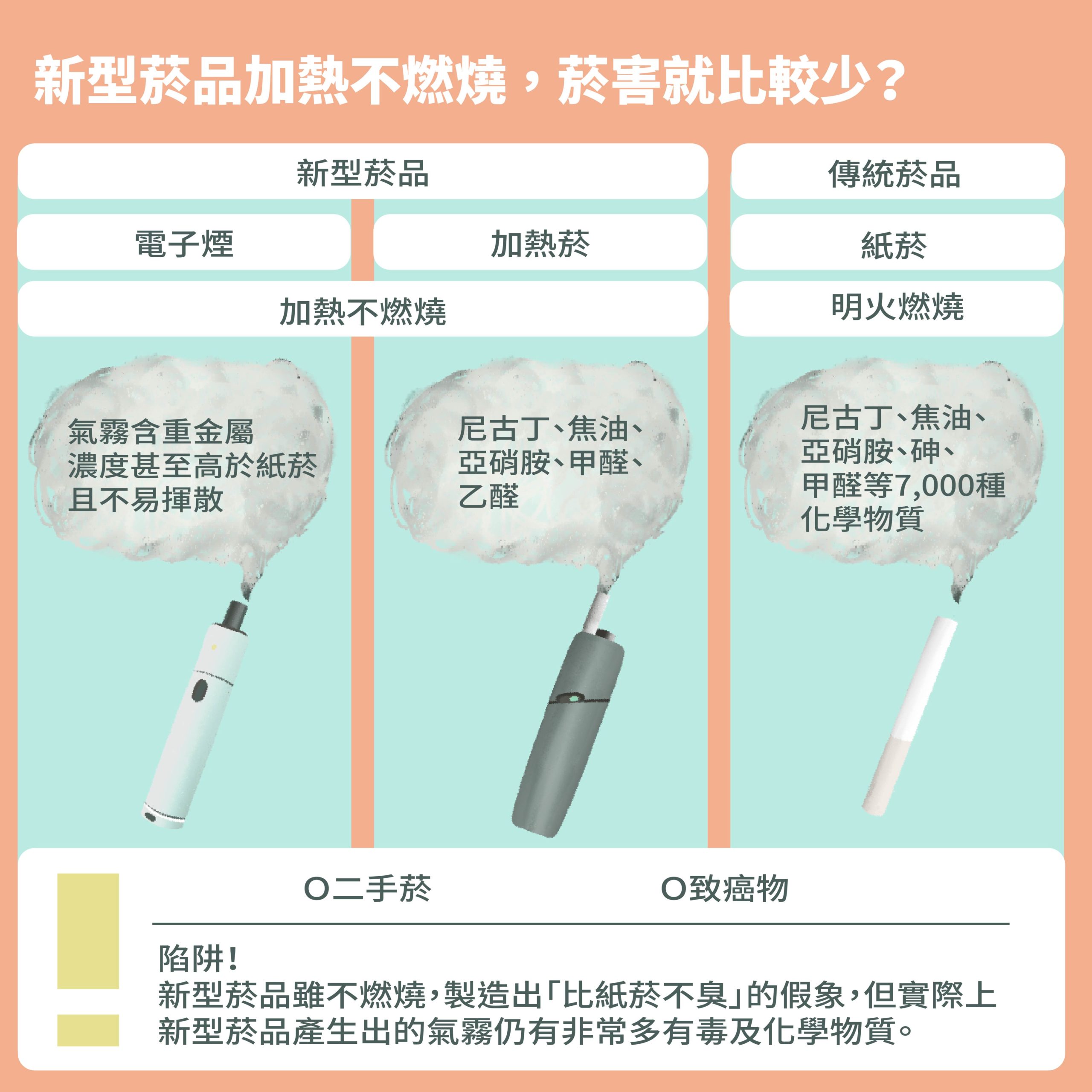 Ang mga pinainit na sigarilyo at e-cigarette ay inilarawan bilang "mga bagong produkto ng sigarilyo" na nagtatampok ng kontroladong pagpainit at mga sangkap na walang tar upang maiwasan ang paglanghap ng mga nakakapinsalang sangkap na makikita sa mga tradisyonal na sigarilyo. Ngunit sa katunayan, ang mga e-cigarette cartridge na puno ng langis ay halos bukas na mga sistema at madaling idagdag sa iba't ibang mga sangkap. Napag-alaman pa nga na may kasamang mga droga sa loob at labas ng bansa. Hindi lamang nila maiwasan ang mga panganib sa usok, ngunit naging gateway na rin sila para sa mga teenager na gumamit ng droga.