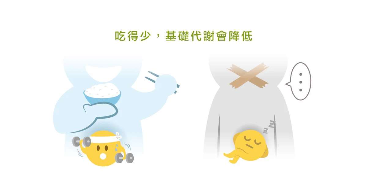 這跟一個叫做「適應性代謝下降」的機制有關。當你長時間吃得太少,身體會開始進入省電模式。你做一樣的事情,消耗變少;本來不覺得累的生活,開始變得很吃力。