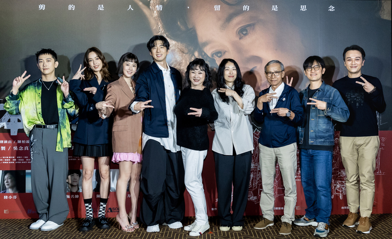 (電影「本日公休」試映會及記者會13日舉辦,演員施名帥(左起)、陳庭妮、方志友、傅孟柏、陸小芬、導演傅天余、監製吳念真、電影主題曲作曲人陳建騏、監製吳明憲出席,並分享拍攝點滴。(威視提供)中央社記者王心妤傳真 112年2月13日 (圖:中央社))