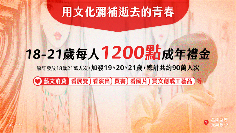 (為振興疫後藝文產業復甦,文化部推出「文化成年禮金」、鎖定18至21歲國民,每人發放1200點,用來欣賞藝文活動或是文化消費。(攝自文化部官網))