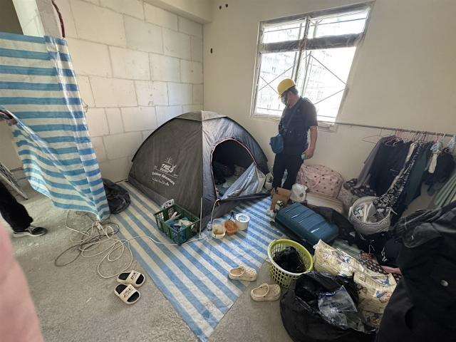 แรงงานไทยกางเต็นท์ ปูพื้นด้วยกระดาษแข็ง นอนในไซต์ก่อสร้าง (ภาพ CNA)