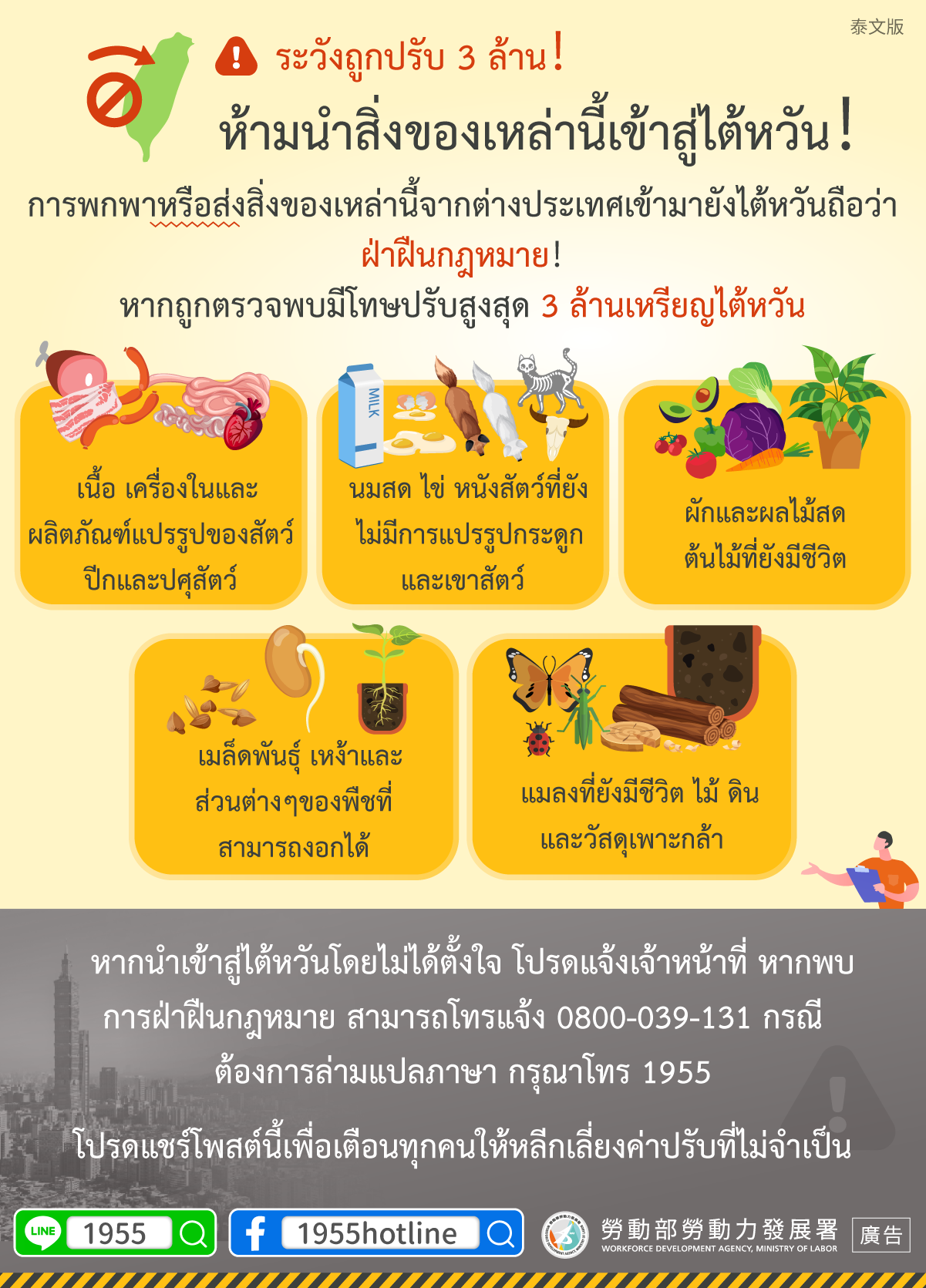 นับถอยหลังสู่ช่วงวันหยุดยาวเทศกาลตรุษจีน ประชาชนไต้หวันจำนวนไม่น้อยจึงนิยมเดินทางไปเที่ยวต่างประเทศในช่วงเวลาดังกล่าว สำนักงานอาหารและยา กระทรวงสาธารณสุขและสวัสดิการไต้หวัน ได้ออกมาย้ำเตือนประชาชนว่า อาหารหรือขนมที่ซื้อกลับมาจากต่างประเทศ นอกจากจะต้องมีปริมาณไม่เกินกฎหมายกำหนดแล้ว จะต้องใช้เพื่อการบริโภคส่วนตัวเท่านั้น ห้ามนำมาวางขายต่อภายในประเทศทั้งทางออนไลน์และออนไซต์โดยเด็ดขาด