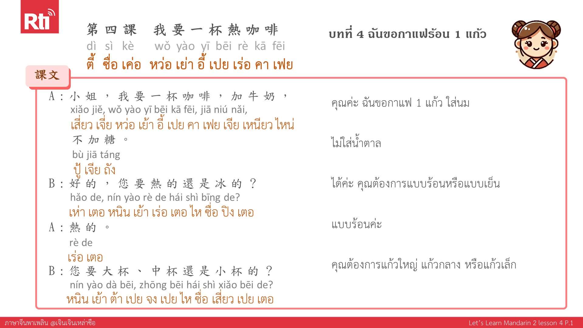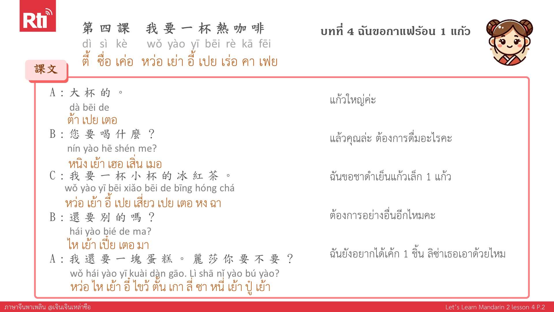 🔺 ปล. ส่งอีเมลมาที่ thai@rti.org.tw เพื่อขอรับเอกสารประกอบการเรียนภาษาจีนพาเพลิน คลิกฟังรายการเพิ่มเติมที่ https://youtu.be/F2ref3nqMbg