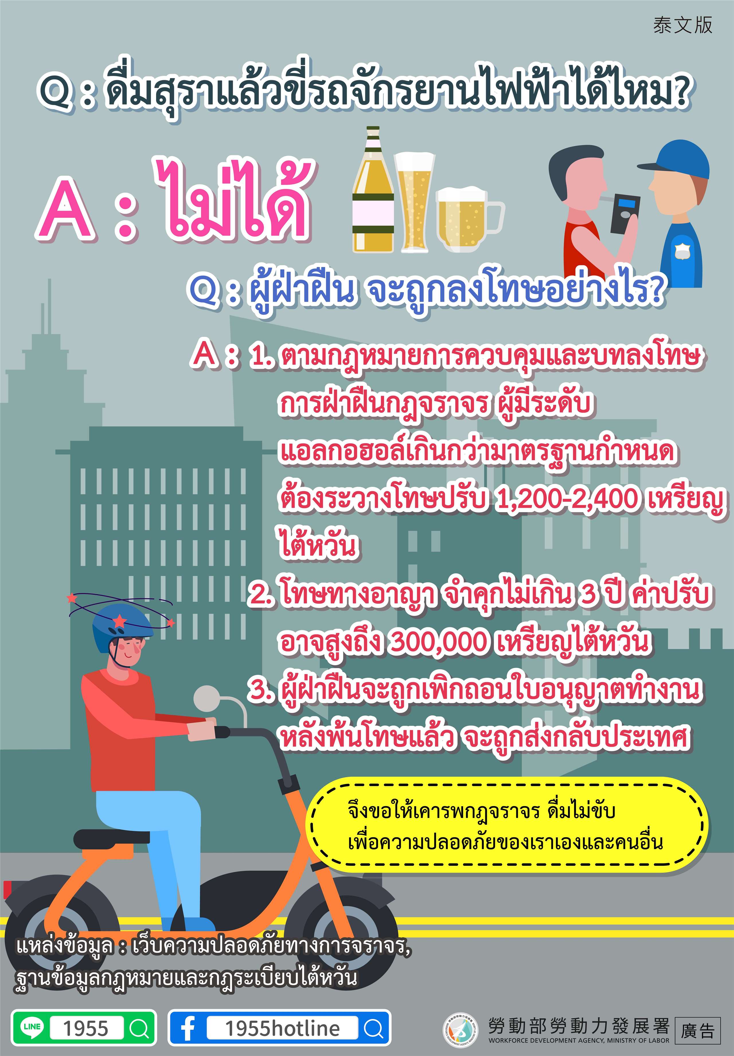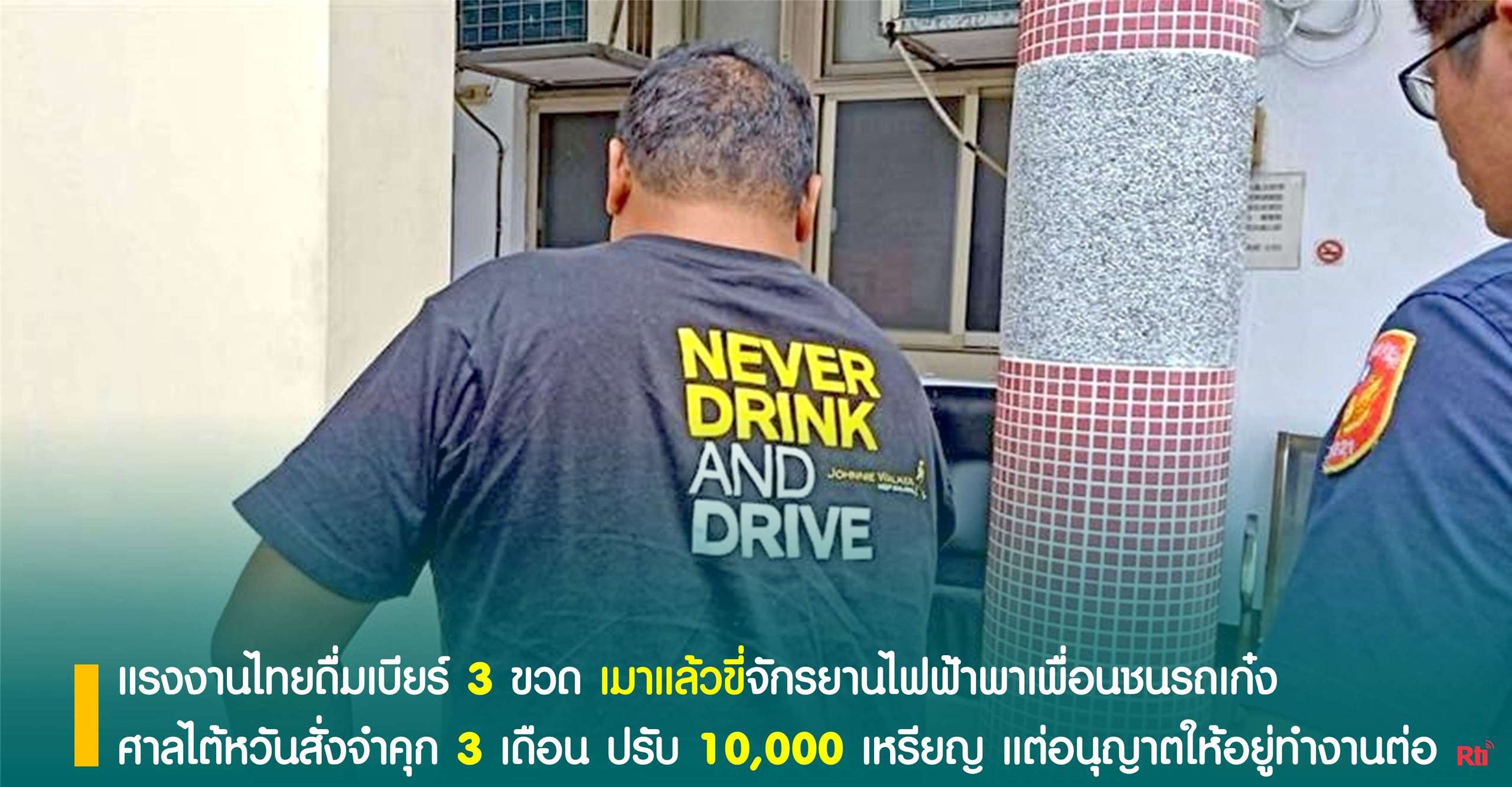 2. แรงงานไทยซดเบียร์ 3 ขวด เมาแล้วขี่รถจักรยานไฟฟ้าพาเพื่อนชนรถเก๋ง ศาลไต้หวันสั่งจำคุก 3 เดือน ปรับอีก 10,000 เหรียญ อนุญาตให้อยู่ทำงานต่อ