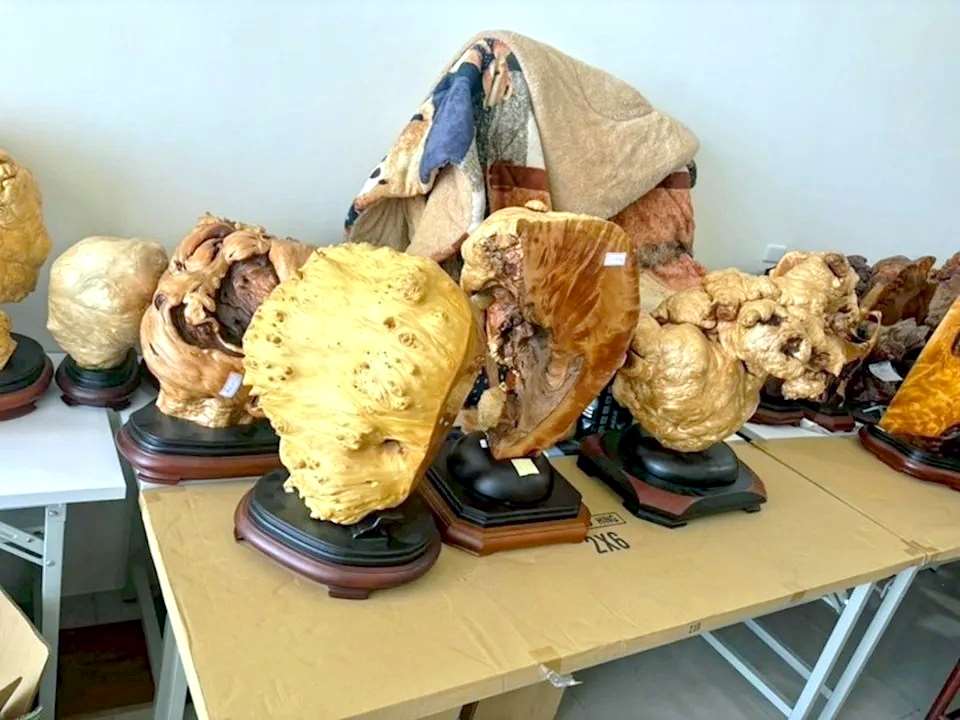ปุ่มไม้ของต้นสนไซเปรสราคาแพงถูกลักลอบนำมาวางขาย (ภาพจากสำนักงานอัยการหนานโถว)