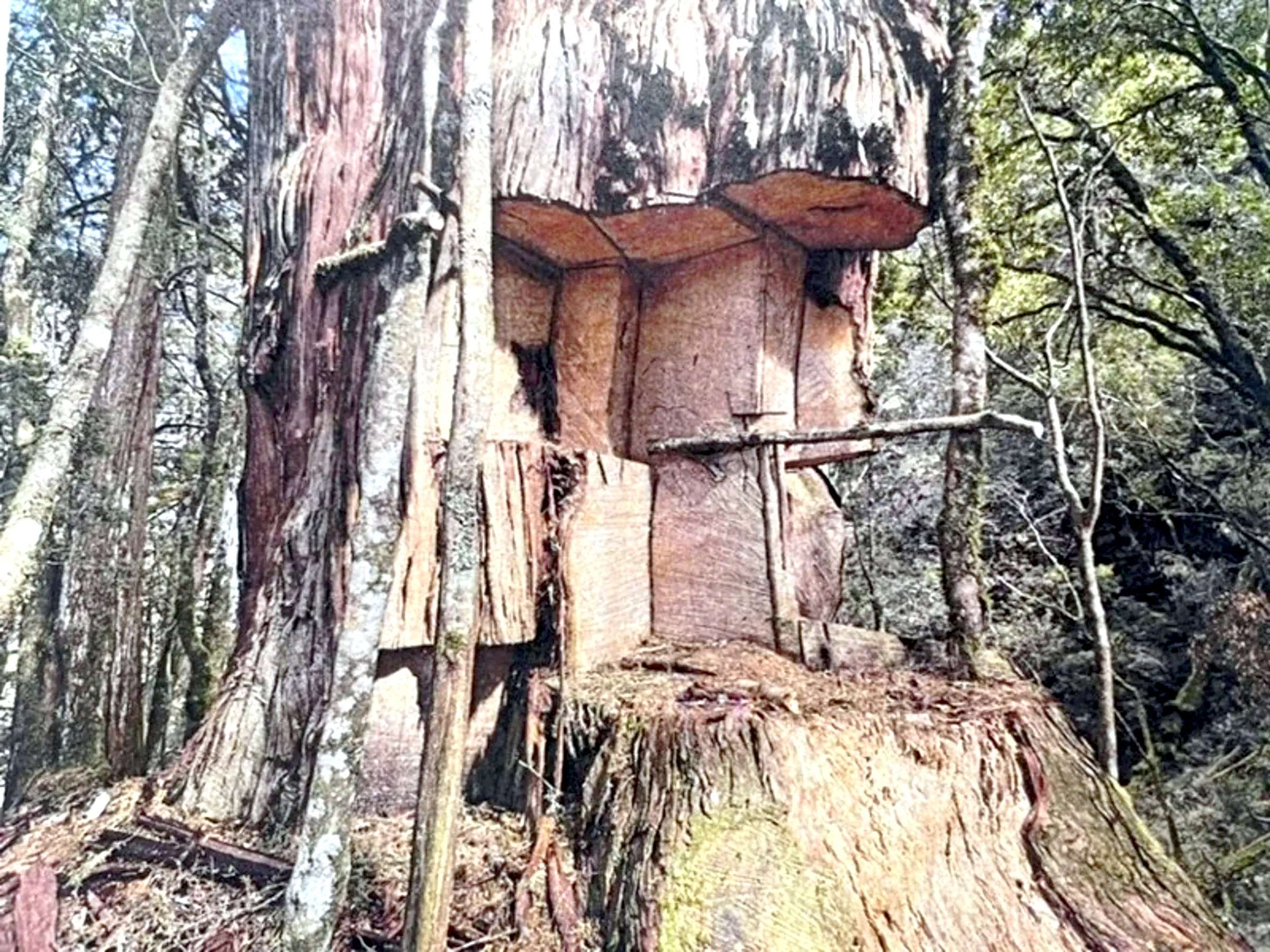 ต้นไม้หอมฮิโนกิหรือต้นสนไซเปรส อายุนับพันปีในป่าลึกเมืองหนานโถวหลายต้น ถูกแก๊งแรงงานเวียดนามใช้เลื่อยไฟฟ้าตัดที่ลำต้นจวนจะโค่นอยู่แล้ว (ภาพจากสำนักงานอัยการหนานโถว)