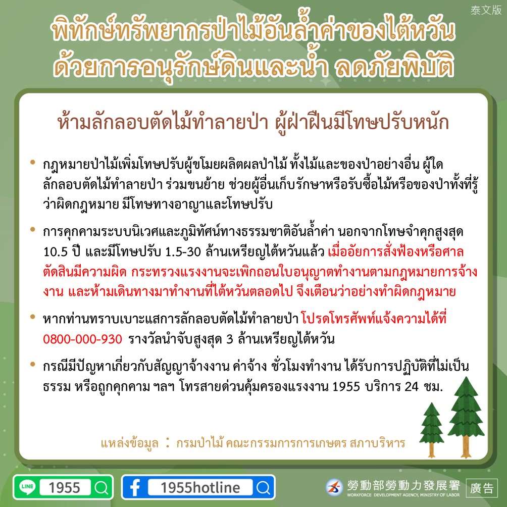 นายหวงข่ายลั่ว หัวหน้ากองจัดการป่าของสำนักอนุรักษ์ป่าไม้สาขาหนานโถวกล่าวว่า ผู้ที่ลักลอบตัดไม้ล้ำค่ามีโทษจำคุกสูงสุด 10 ปี 6 เดือน และปรับตั้งแต่ 1 ล้านถึง 20 ล้านเหรียญไต้หวัน ขอเตือนแรงงานต่างชาติและชาวไต้หวันอย่าได้ฝ่าฝืนกฎหมาย