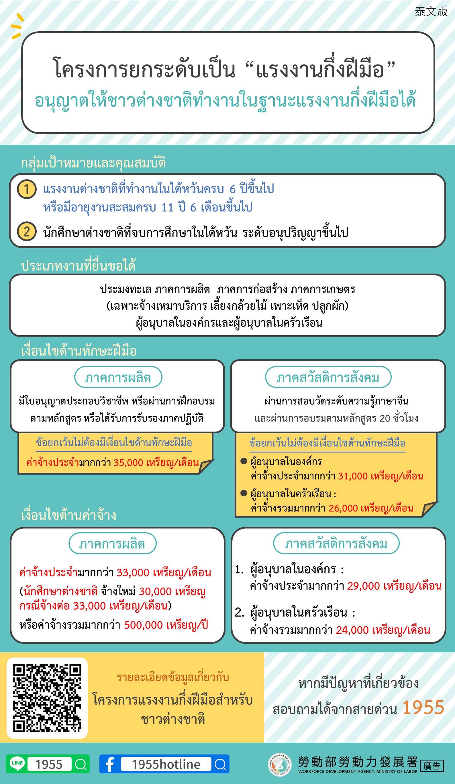 - ภาคการผลิต เช่น โรงงานอุตสาหกรรม ก่อสร้าง ประมง โรงฆ่าสัตว์ และเกษตร : 33,000 เหรียญไต้หวันต่อเดือน