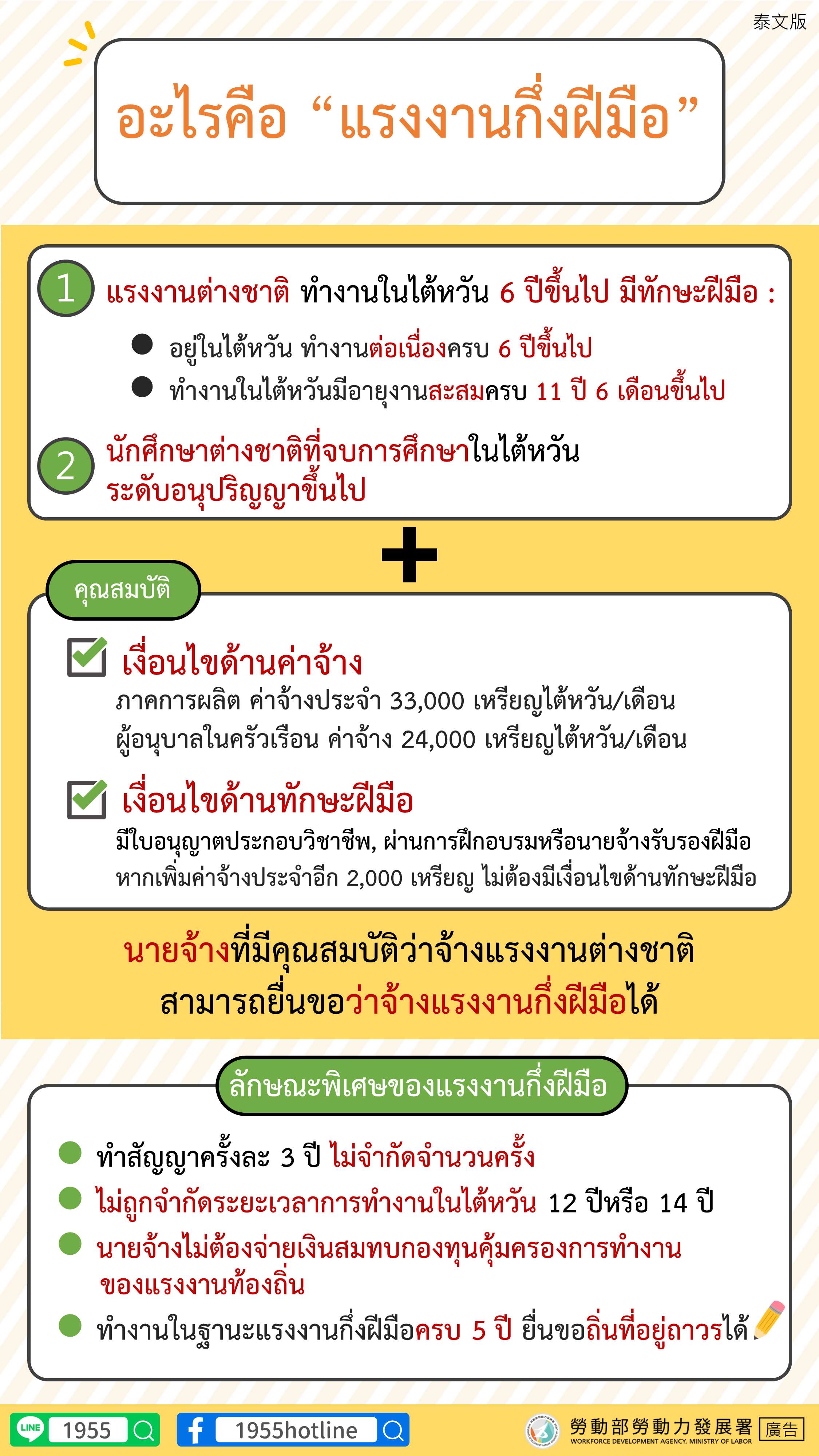กรณีที่มีการปรับค่าจ้างแรงงานกึ่งฝีมือในภาคการผลิตเพิ่มเป็น 35,000 เหรียญไต้หวัน ไม่ต้องผ่านข้อกำหนดด้านใบรับรองหรือหลักสูตรฝึกอบรมเพิ่มเติม ส่วนแรงงานกึ่งฝีมือที่เป็นผู้อนุบาลในองค์กรและในครัวเรือน หากจ่ายค่าจ้างมากกว่า 31,000 และ 26,000 ดอลลาร์ไต้หวันตามลำดับ ก็จะได้รับการยกเว้นไม่ต้องมีใบรับรองใด ๆ เช่นกัน