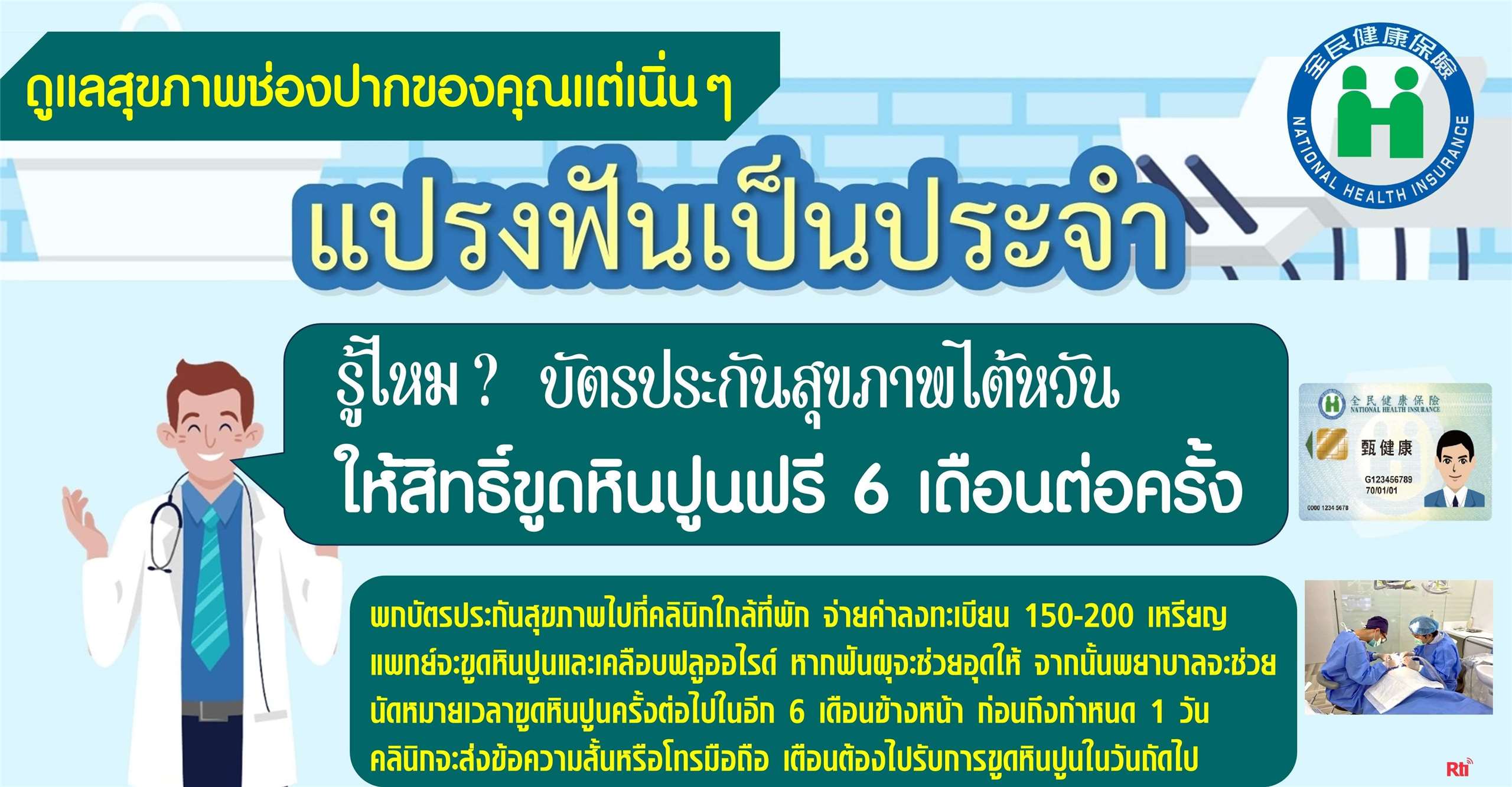 ระบบประกันสุขภาพของไต้หวันมีสวัสดิการดี ๆ หลายอย่าง แรงงานไทยหลายคนอาจไม่รู้และไม่ได้ไปใช้บริการ ที่อยากแนะนำคือ การขูดคราบหินปูนตามซอกฟันฟรี 6 เดือนต่อครั้ง
