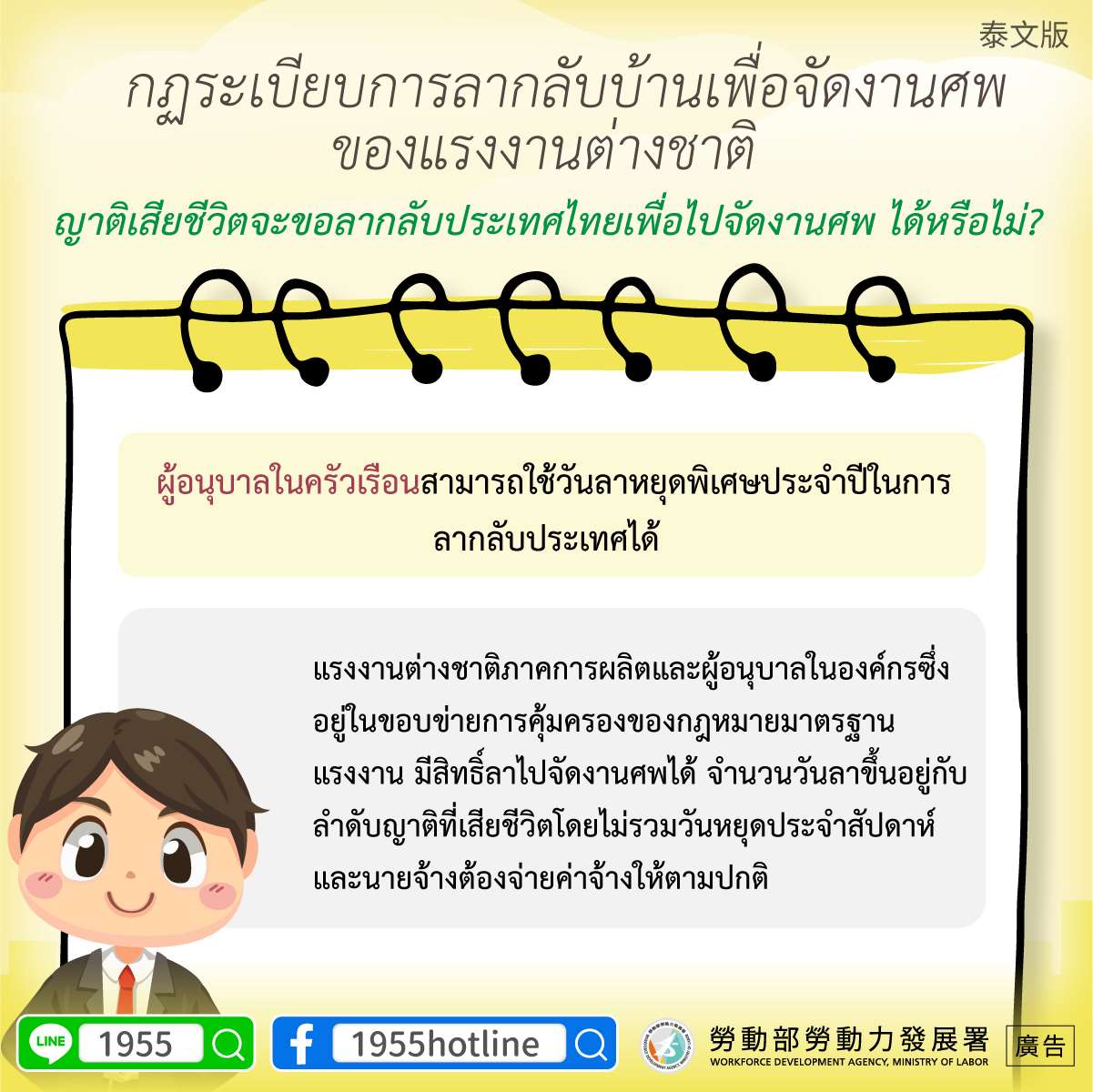 1. รู้จักสิทธิการลาของไต้หวัน! รู้ไหมแรงงานต่างชาติมีสิทธิ์ลากลับบ้านเพื่อจัดงานศพบิดามารดาหรือคู่สมรส 8 วันโดยได้รับค่าจ้าง