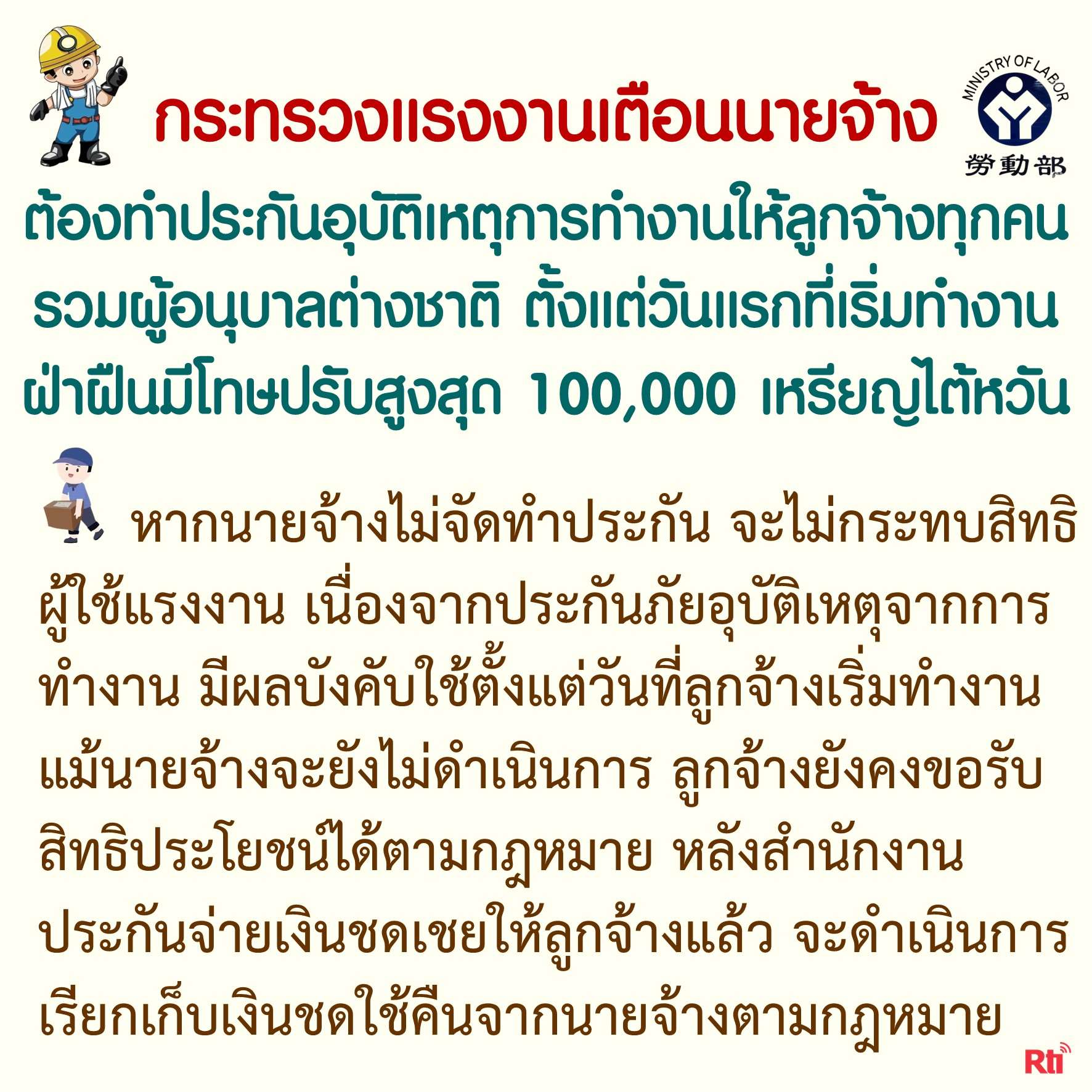 2. กระทรวงแรงงานเตือนนายจ้าง ต้องทำประกันภัยอุบัติเหตุจากการทำงานให้ลูกจ้างในวันแรกที่เริ่มงาน ฝ่าฝืนมีโทษปรับ 20,000 เหรียญไต้หวันขึ้นไป