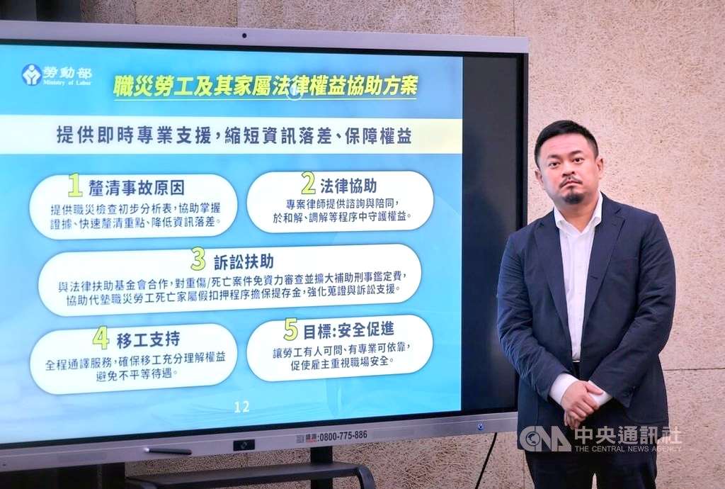 กระทรวงแรงงานไต้หวันประกาศเตรียมเปิดตัวโครงการช่วยเหลือด้านสิทธิตามกฎหมายแก่ลูกจ้างและครอบครัวผู้ประสบอุบัติเหตุจากการทำงาน เริ่มเดือนมกราคม 2569 เป็นต้นไป เพื่อให้ความช่วยเหลืออย่างครบวงจรแก่ลูกจ้างที่ได้รับบาดเจ็บสาหัสหรือเสียชีวิตจากอุบัติเหตุในที่ทำงาน โดยไม่จำกัดฐานะทางการเงินของผู้ขอรับความช่วยเหลือ ครอบคลุมตั้งแต่ขั้นตอนเจรจาไกล่เกลี่ยไปจนถึงการดำเนินคดี สำหรับแรงงานต่างชาติ นอกจากบริการข้างต้นแล้ว ยังจะมีบริการล่ามตลอดกระบวนการโดยไม่จำกัดเวลา เพื่อให้สามารถสื่อสารและใช้สิทธิตามกฎหมายได้อย่างเท่าเทียม