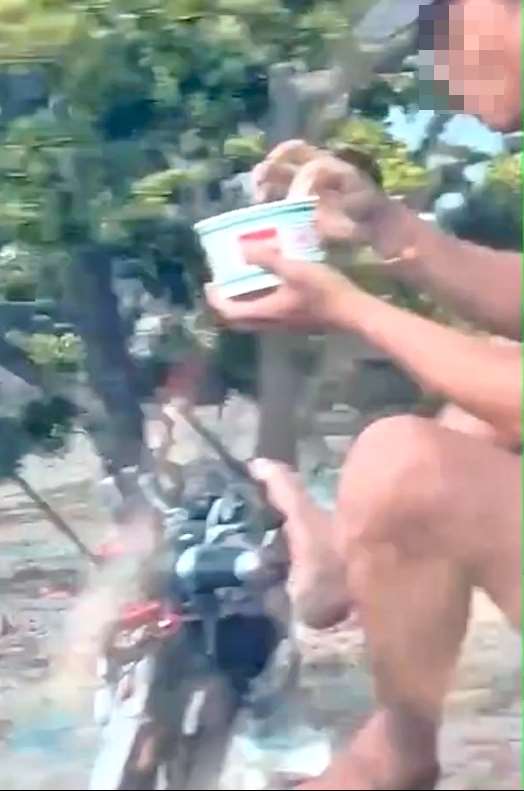 คลิปวิดีโอดังกล่าวถูกเผยแพร่ผ่าน YouTube ช่อง WoWtchout โดยผู้เห็นเหตุการณ์เล่าว่า ระหว่างขับรถในช่วงกลางวันผ่านถนนสาย 150 ได้พบชายรายหนึ่งขี่รถจักรยานไฟฟ้าที่ไม่ได้ติดแผ่นป้ายทะเบียน ลักษณะท่านั่งผิดปกติ ขาทั้งสองข้างยกขึ้นคล้ายท่านั่งขัดสมาธิ ในมือเหมือนถือสิ่งของบางอย่าง ขณะรถโคลงเคลงไปมาอย่างเห็นได้ชัด เมื่อขับเข้าไปใกล้จึงพบว่า ชายคนดังกล่าวซึ่งคาดว่าเป็นแรงงานต่างชาติ กำลังใช้มือทั้งสองประคองชามบะหมี่กึ่งสำเร็จรูปเพื่อรับประทานบนรถ พร้อมใช้เท้าขวาเหยียบคันเร่ง และวางเท้าซ้ายไว้บนแผงด้านล่างของรถ สร้างความหวาดเสียวแก่ผู้เห็นเหตุการณ์เป็นอย่างมาก