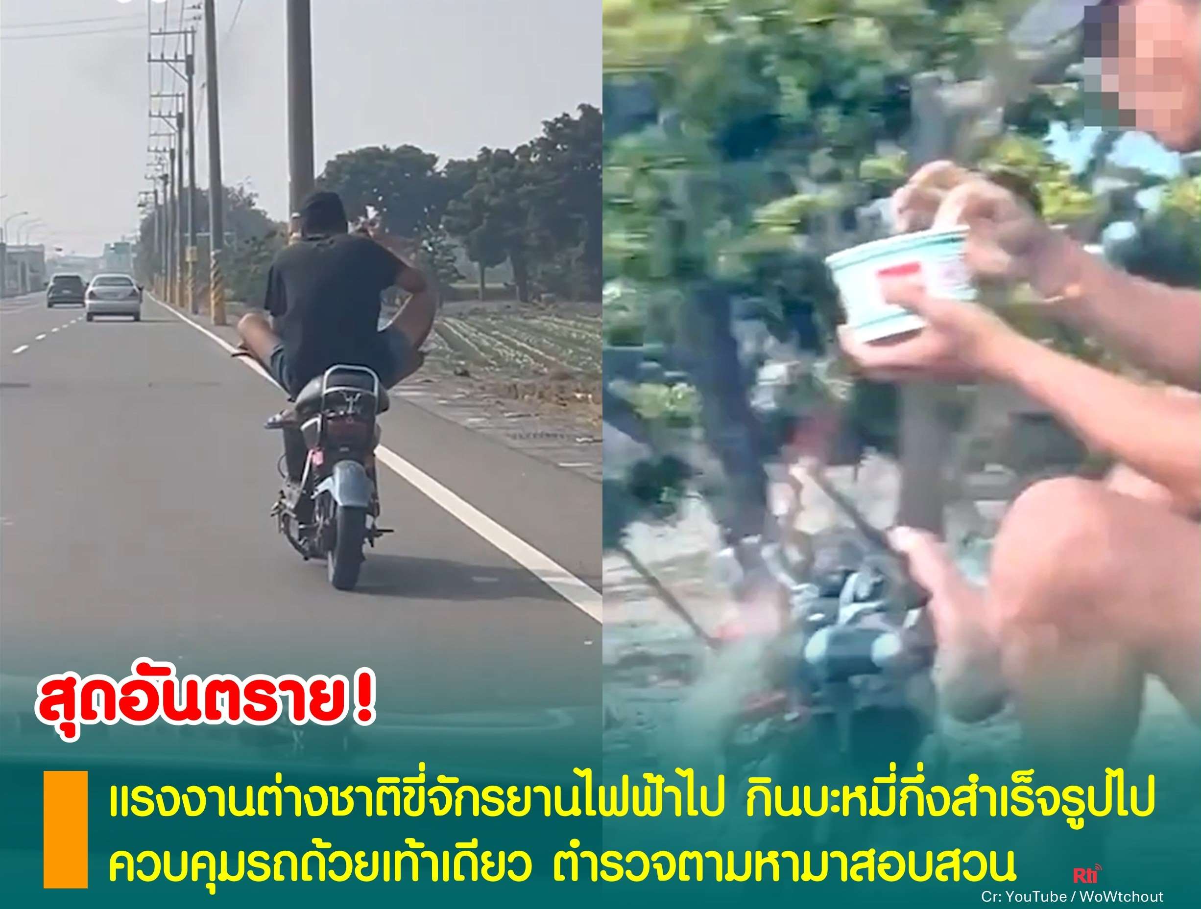 ชาวเน็ตผงะ! แรงงานต่างชาติขี่จักรยานไฟฟ้าไป กินบะหมี่กึ่งสำเร็จรูปไป ควบคุมรถด้วยเท้าเดียว ส่ายไปมาตลอดทาง ตำรวจเตรียมสอบสวน