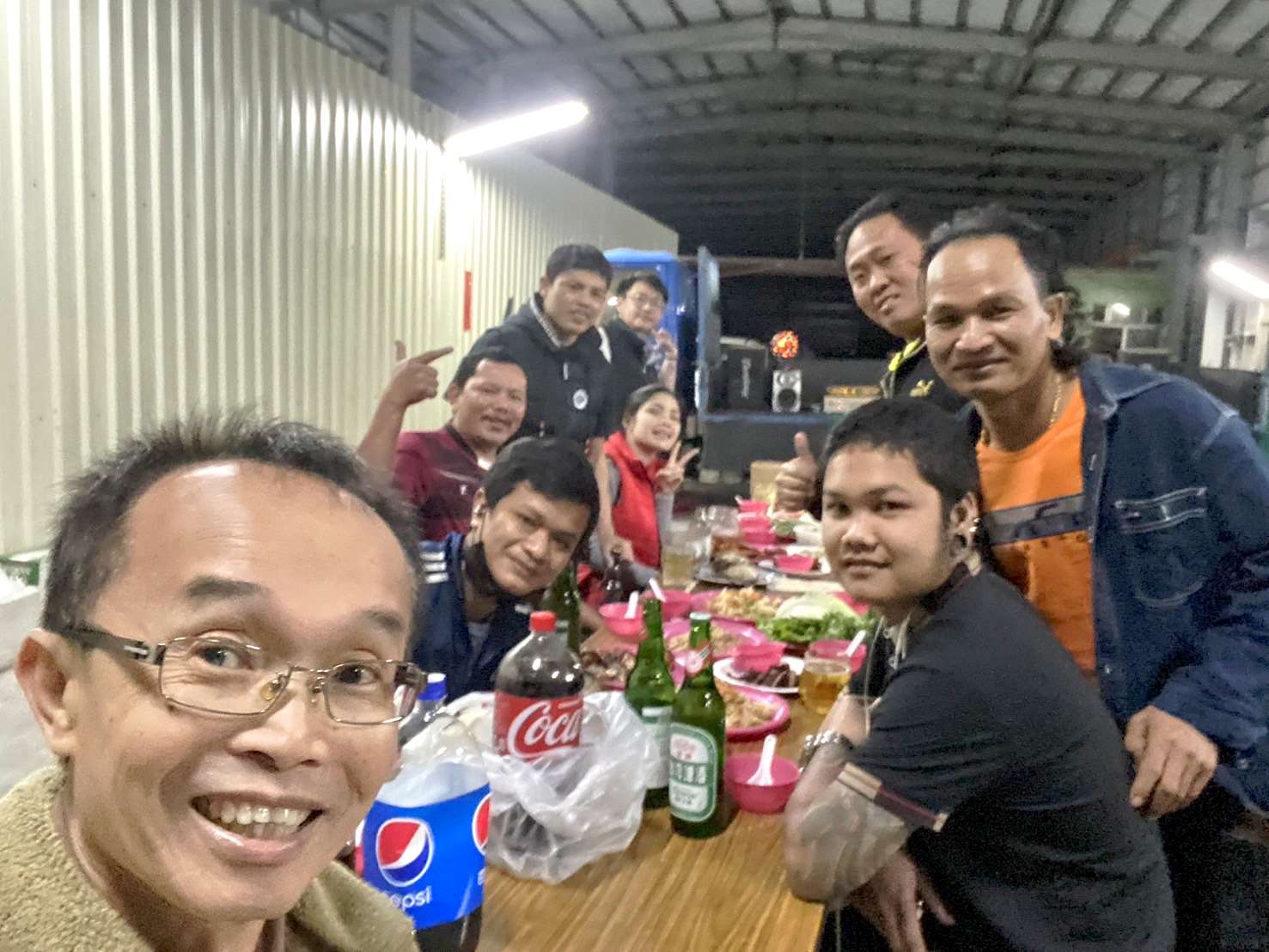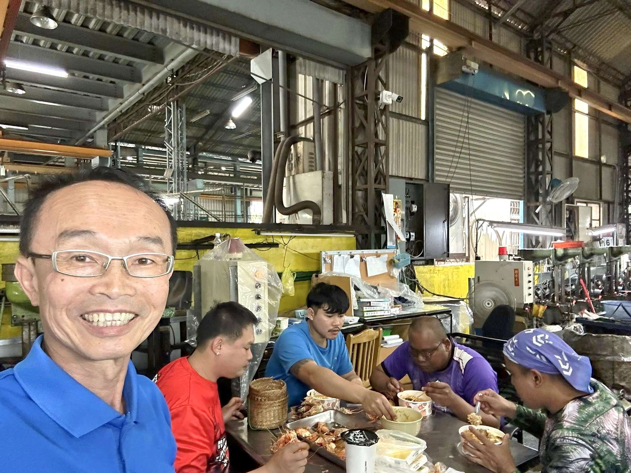ทั้งเถ้าแก่ แรงงานท้องถิ่นและแรงงานไทยในโรงงานนี้ อยู่กันอย่างอบอุ่นเสมือนครอบครัวใหญ่ ในภาพนายเฉินหย่งเหอ (คนที่ 1 จากซ้าย) เถ้าแก่ผู้ใจดีร่วมรับประทานอาหารไทยกับลูกน้องทุกคน ซึ่งจัดเลี้ยงเป็นประจำ (ภาพจาก FB เฉินหย่งเหอ)