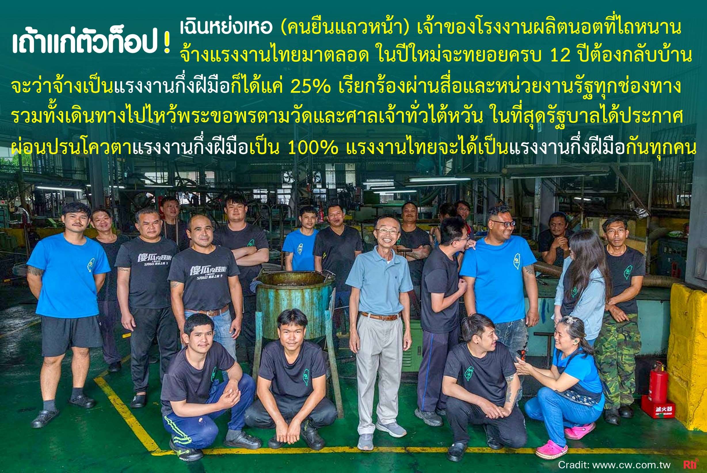 พูดถึงบริษัทเซิ่งไท่ หรือ CLC Industrial Co., Ltd.ในนครไถหนาน ปัจจุบันว่าจ้างแรงงานไทย 11 คน และพนักงานท้องถิ่นอีกกว่า 30 คน ในรายการของเราเคยนำเสนอข่าวก่อนหน้านี้ว่า เป็นโรงงานผลิตนอตที่จ้างแรงงานไทยเพียงชาติเดียวมาเป็นเวลากว่า 30 ปี นายจ้างใจดีมาก เป็นกันเอง ในวันหยุดหรือวันฉลองเทศกาลสำคัญของไทยและไต้หวัน จะออกค่าใช้จ่ายให้คนงานไทยซื้อวัตถุดิบมาทำอาหารแบบไทย ๆ กินเลี้ยงกันประมาณเดือนละครั้ง พนักงานท้องถิ่นทุกคนรวมทั้งเถ้าแก่และสมาชิกในครอบครัวต่างก็ชอบกินอาหารไทย ทั้งโรงงานเต็มไปด้วยบรรยากาศที่อบอุ่น ลูกจ้างทุกคนทำงานอย่างขยันขันแข็ง สามัคคี และใช้ชีวิตอยู่ร่วมกันฉันพี่น้อง ทำให้โรงงานแห่งนี้คล้ายเป็นครอบครัวขนาดใหญ่ ไม่มีการแบ่งว่าเป็นพนักงานท้องถิ่นหรือแรงงานต่างชาติ และที่น่าสนใจคือ ไม่ว่าจะแรงงานท้องถิ่นหรือแรงงานไทย จะได้รับสวัสดิการเท่ากันหมด โดยก่อนตรุษจีนทุกปี นอกจากแจกเงินโบนัสปลายปีแล้ว เถ้าแก่จะถามแรงงานไทยว่า จะกลับบ้านไปเยี่ยมครอบครัวไหม? ใครกลับบ้านจะออกค่าตั๋วเครื่องบินไป-กลับให้ หรือพาไปท่องเที่ยวต่างประเทศ ปีที่ผ่านมานี้ เถ้าแก่ไม่ถามอีกต่อไป ใช้วิธีจ่ายค่าตั๋วเครื่องบินไป-กลับให้แรงงานไทยที่ประสงค์จะกลับบ้านไปพักร้อนหรือเยี่ยมญาติ ส่วนใครที่เพิ่งกลับบ้านมา มีโครงการไปเที่ยวประเทศไหนก็ตาม เถ้าแก่จะออกค่าใช้จ่ายให้ทุกคน สำหรับแรงงานไทย ซึ่งปัจจุบันมี 11 คน ปีนี้กลับบ้านไปพักร้อน 6 คน ที่เหลือเลือกไปเที่ยวประเทศอื่น โดยเถ้าแก่ออกค่าเดินทางให้ทั้งหมด ความเอาใจใส่ต่อลูกน้องไม่ว่าจะแรงงานท้องถิ่นหรือแรงงานไทยของเถ้าแก่รายนี้ ถูกสื่อไต้หวันรายงานเป็นข่าว ชาวเน็ตกว่า 4,000 รายแห่กดไลค์กดแชร์ และคอมเมนต์แสดงความชื่นชมว่า เถ้าแก่ใจพระ บางรายถามว่า ที่โรงงานยังขาดคนงานอีกไหม?