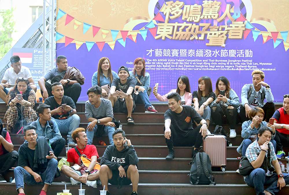 แรงงานต่างชาตินั่งพักผ่อนหน้าศูนย์การค้าอาเซียนสแควร์ นครไทจง (ภาพจาก gvm.com.tw)