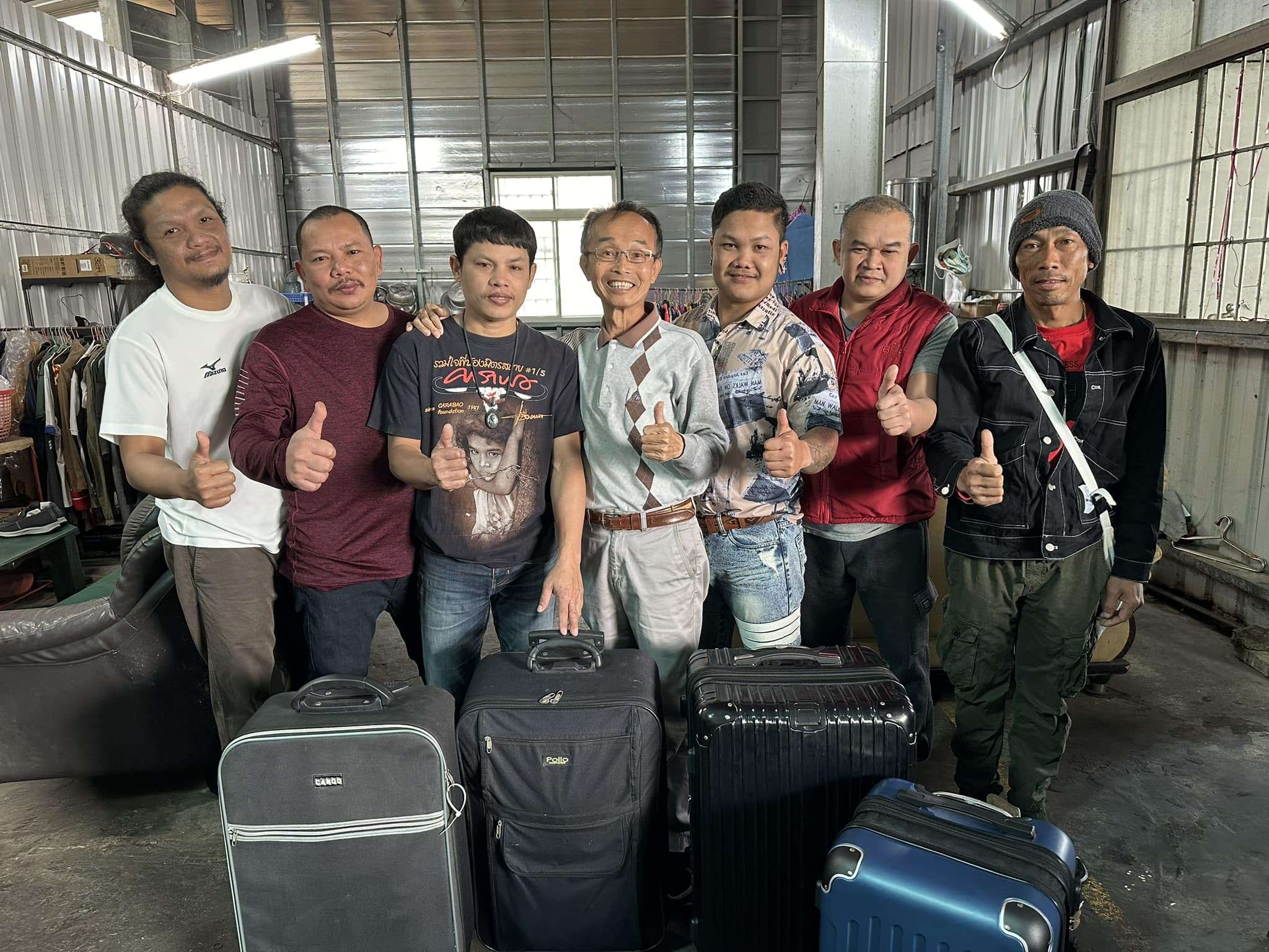 นายเฉิน หย่งเหอ (คนกลาง) เป็นกันเองกับลูกน้อง ออกค่าเดินทางให้แรงงานไทยทุกคนที่จะกลับบ้านหรือไปเที่ยวต่างประเทศช่วงตรุษจีน ถ่ายภาพกับแรงงานไทย 6 คนก่อนเดินทางกลับประเทศเมื่อปี 2566 (ภาพจาก FB เฉินหย่งเหอ)
