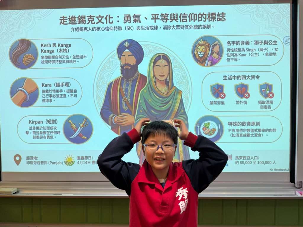 หลิวเฉิงเอิน (劉承恩) นักเรียนจากโรงเรียนประถมซิ่วหลัง ได้แบ่งปันภูมิหลังทางวัฒนธรรมของชาวซิกข์ (Sikh) ในประเทศมาเลเซีย ซึ่งเชื่อว่าเส้นผมเป็นของขวัญอันศักดิ์สิทธิ์จากพระเจ้า จึงไม่ตัดผมตลอดชีวิตและสวมผ้าโพกศีรษะ นอกจากนี้ เขายังกล่าวถึงการออกแบบกฎหมายในท้องถิ่นที่คำนึงถึงเสรีภาพทางศาสนา โดยอนุญาตให้ชาวซิกข์ได้รับการยกเว้นไม่ต้องสวมหมวกนิรภัยขณะขี่รถจักรยานยนต์ สิ่งนี้ช่วยให้เขาเข้าใจถึงความเชื่อมโยงเชิงลึกระหว่างศรัทธา ค่านิยม และบรรทัดฐานทางสังคม