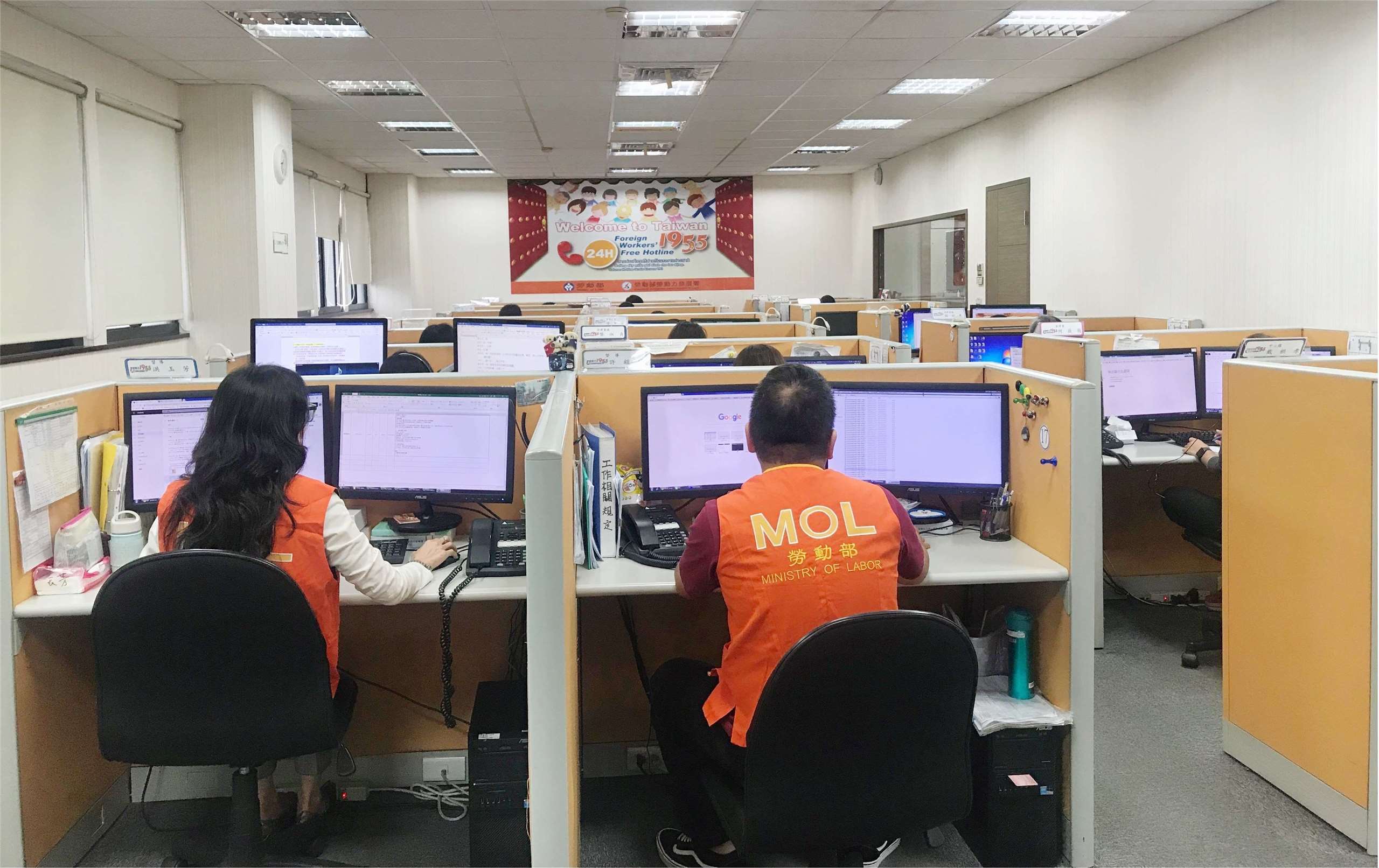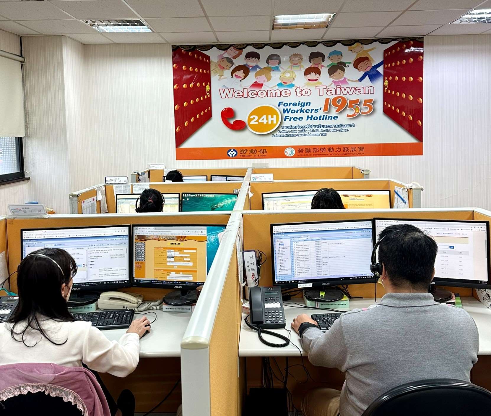 สายด่วนคุ้มครองแรงงาน 1955 มีล่าม 5 ภาษาจำนวน 45 คน คอยให้บริการรับโทรศัพท์จากแรงงานต่างชาติตลอด 24 ชั่วโมง ทุกวันไม่เว้นวันหยุด