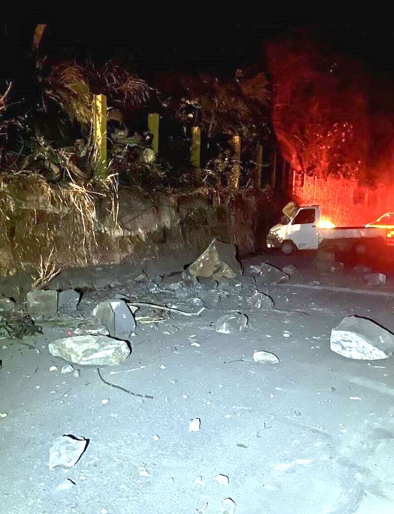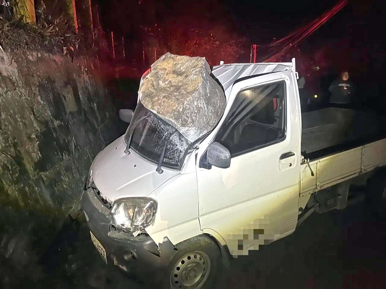 หินจำนวนมากหล่นลงมาจากไหล่เขาที่เหมียวลี่ ตกใสรถกระบะเล็กคันหนึ่งที่กำลังวิ่งผ่าน 2 แรงงานฟิลิปปินส์รอดปาฏิหาริย์ (ภาพจาก setn.com)