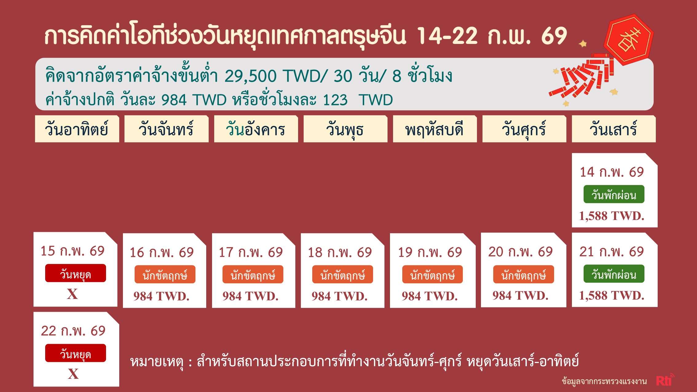 ตั้งแต่ปีนี้เป็นต้นไป ค่าจ้างขั้นต่ำได้ปรับเพิ่มเป็น 29,500 เหรียญไต้หวันต่อเดือน ส่วนลูกจ้างชาวไต้หวันที่ทำงานเป็นรายชั่วโมง ปรับเพิ่มเป็น 196 เหรียญไต้หวันต่อชั่วโมง หากนายจ้างให้แรงงานต่างชาติที่รับค่าจ้างขั้นต่ำทำงานในช่วงวันหยุดนักขัตฤกษ์ ต้องจ่ายค่าโอทีเพิ่มขึ้นอีก 1 วัน (ไม่เกิน 8 ชั่วโมง) หรือ 984 เหรียญไต้หวัน ส่วนการทำงานในวันพักผ่อนประจำสัปดาห์ ได้แก่ 14 และ 21 กุมภาพันธ์ จ่ายค่าจ้างใน 2 ชั่วโมงแรก 1.34 เท่าและชั่วโมงที่ 4-8 จ่ายค่าจ้างทำงานล่วงเวลา 1.67 เท่าของค่าจ้างปกติ หรือรวม 8 ชั่วโมง 1,588 เหรียญไต้หวัน สำหรับวันหยุดประจำสัปดาห์ ได้แก่ 15 และ 22 กุมภาพันธ์ เป็นวันหยุดประจำสัปดาห์ที่ทำโอทีไม่ได้ ยกเว้นมีเหตุฉุกเฉินหรือภัยธรรมชาติ