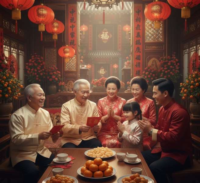 - วันตรุษจีน (วันที่ 1 เดือน 1) ไหว้ปีใหม่ ต้องกล่าวคำอวยพรแก่ผู้ใหญ่ เช่น ซินเหนียนไขว้เล่อ (สวัสดีปีใหม่) กงสี่ฟาไฉ (ขอให้ร่ำรวย) ผู้ใหญ่จะมอบซองอั่งเปาให้เด็กๆ โดยบางครอบครัวจะเริ่มวันแรกของปีด้วยการกินเจ เพื่อสื่อถึงความบริสุทธิ์และสร้างบุญกุศล แต่ส่วนใหญ่จะใส่เสื้อผ้าใหม่ เพราะการสวมใส่เสื้อผ้าใหม่ โดยเฉพาะสีแดง ซึ่งเป็นสีมงคล สื่อถึงการเริ่มต้นใหม่ที่ดี และจะมีการจุดประทัดเพื่อขับไล่สิ่งไม่ดีและสร้างบรรยากาศที่ครึกครื้น เยี่ยมเยียนญาติและเพื่อน หรือเรียกว่า โจ่วชุน คือการไปมาหาสู่และส่งคำอวยพรให้กัน