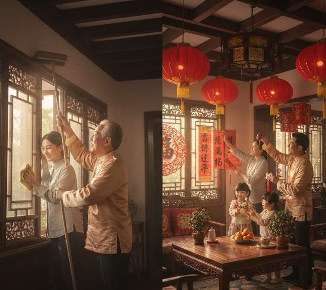 - วันส่งท้ายปีเก่า (เดือน 12 วันที่ 29 หรือ 30 ตามปฏิทินจันทรคติจีน) ทำความสะอาดบ้าน ก่อนตรุษจีนต้องทำความสะอาดบ้านครั้งใหญ่ เพื่อสื่อถึงการ "ส่งท้ายปีเก่า ต้อนรับปีใหม่" และขจัดสิ่งไม่ดี ติดคำกลอนและป้ายอักษรมงคล หรือ ชุนเหลียน การติดคำกลอนฤดูใบไม้ผลิ (春 - ชุน) หรืออักษร 福 (ฝู - ความสุข) สร้างบรรยากาศแห่งเทศกาล ตามด้วยการรับประทานอาหารเย็นร่วมกัน ครอบครัวจะมารวมตัวกันเพื่อรับประทานอาหารเย็นอย่างอุดมสมบูรณ์ ซึ่งสื่อถึงความสุขสมบูรณ์และความเจริญรุ่งเรือง เมนูยอดนิยมได้แก่ ปลา (สื่อถึงความมั่งคั่ง) และขนมเข่ง (หมายถึงความเจริญก้าวหน้า) ฯลฯ อยู่เฝ้ารอปีใหม่ หลังอาหารเย็น เหล่าลูกหลานจะ "เฝ้ารอปีใหม่" เพื่ออวยพรให้ผู้สูงอายุมีอายุยืนยาว และเพื่อแสดงความกตัญญู และจะมีการไหว้บรรพบุรุษและเทพเจ้า ขอบคุณการปกปักรักษาของบรรพบุรุษ และขอพรให้ปีใหม่ปลอดภัยและราบรื่น รวมถึงการจุดประทัด ในช่วงเที่ยงคืน เพื่อขับไล่สิ่งชั่วร้ายและต้อนรับสิ่งดีๆ
