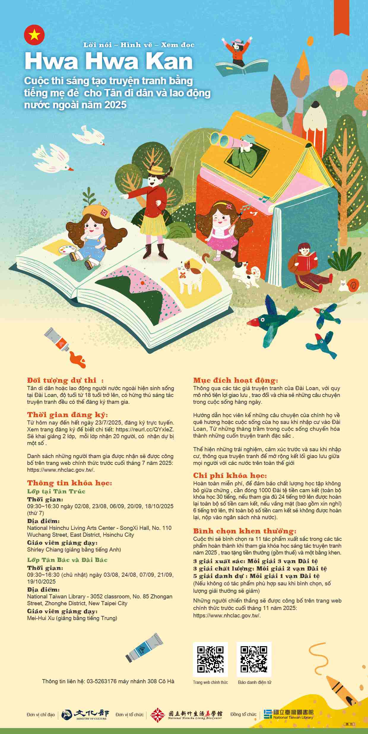 Nhằm trân trọng và gìn giữ những trải nghiệm sống phong phú ấy, bắt đầu từ năm 2019, Bào tàng Đời sống mỹ thuật Tân Trúc nhận ủy thác từ Bộ Văn hóa Đài Loan đã triển khai “Khóa bồi dưỡng sáng tác sách tranh dùng ngôn ngữ mẹ đẻ dành cho di dân mới và lao động di trú”. Thông qua các buổi học ngắn hạn, khóa bồi dưỡng hướng dẫn học viên sử dụng chính ngôn ngữ tiếng mẹ đẻ của mình để sáng tác sách tranh, kết hợp giữa hình ảnh và lời kể nhằm ghi lại hành trình rời xa quê hương và xây dựng cuộc sống mới nơi xứ người. Đây không đơn thuần chỉ là sáng tác - mà là một hành trình lưu giữ những câu chuyện về giao thao văn hóa và khẳng định giá trị cá nhân. Nội dung câu truyện đa dạng, từ ký ức tuổi thơ, phong tục quê nhà, tình cảm gia đình cho đến những trải nghiệm tại Đài Loan - tất cả đều rất chân thật và đầy cảm xúc. Những quyển sách tranh này đã trở thành chiếc cầu nối giữa cá nhân và cộng đồng, giữa truyền thống và hiện đại, giúp độc giả hiểu sâu hơn về những người nước ngoài - những người thực chất đã là một phần không thể thiếu trong văn hóa Đài Loan. Thông qua khóa bồi dưỡng này, tiếng nói của di dân mới và lao động di trú không chỉ được lắng nghe, mà còn được lan tỏa. “Đa văn hóa” vì thế không chỉ là một khẩu hiệu – mà được thể hiện một cách sống động, chân thực qua từng trang sách tranh đầy màu sắc và cảm xúc.
