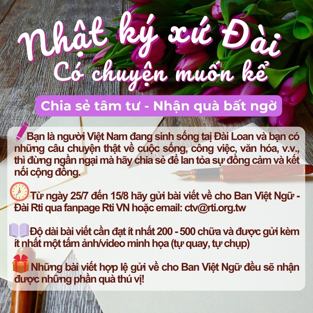 📣 Lần này Ban Việt Ngữ đài Rti mời bạn gửi về một câu chuyện nhỏ nhưng thật - từ đời sống, công việc, hàng xóm, giao tiếp, văn hoá, ẩm thực... bất kỳ điều gì khiến bạn ấn tượng khi sống tại Đài Loan. Cộng đồng lớn lên từ những sẻ chia nhỏ. Viết cho mình, và cho cả những người Việt khác cùng đọc. Và vì đôi khi, chỉ cần một người kể chuyện, nhiều người được chữa lành. Viết ra để kể, để giữ lại, và để những người Việt khác - dù lớn hay nhỏ tuổi - đọc được, cảm thấy gần nhau hơn một chút.