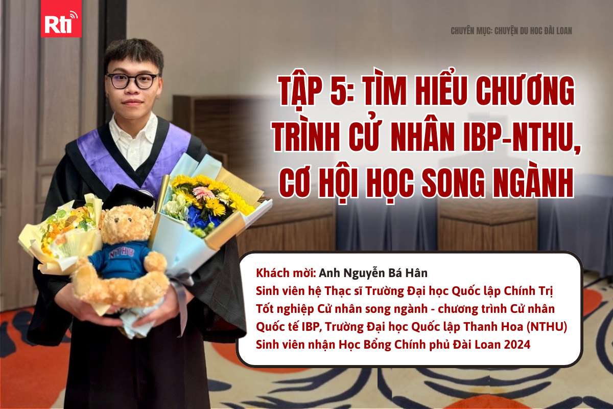 Tiếp nối chủ đề về trường Đại học Quốc lập Thanh Hoa, trong tập này RTI sẽ giới thiệu đến các bạn cơ hội học Cử nhân song ngành dành cho sinh viên quốc tế, qua cuộc phỏng vấn với Anh Nguyễn Bá Hân. Anh Hân là cựu sinh viên chuyên ngành Ngôn ngữ và văn hóa Trung Hoa cùng Quản trị nguồn nhân lực, thuộc chương trình Cử nhân Quốc tế IBP do trường Đại học Quốc lập Thanh Hoa đào tạo.