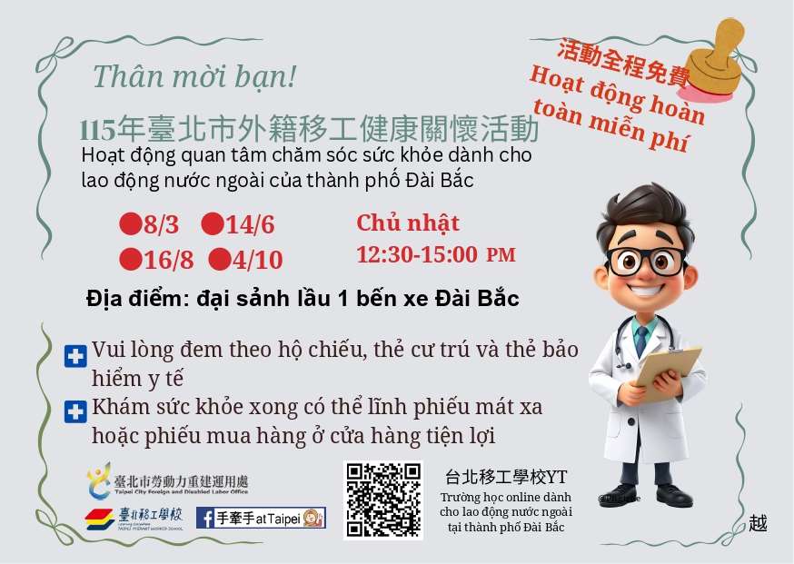 3. Hoạt động Khám sức khỏe miễn phí dành cho lao động di trú năm 2026 do Chính quyền thành phố Đài Bắc tổ chức sẽ diễn ra buổi đầu tiên vào ngày 8/3